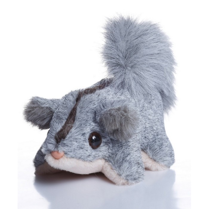 Peeper has a pointed face, pink nose and a very bushy grey tail.